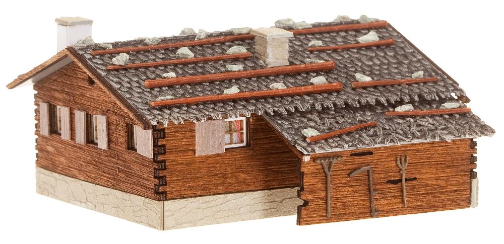 Stützpunkt für schwindelfreie Gipfelstürmer. Eingeschossige Gebirgshütte mit Steinfundament und gebeizter Lasercut-Verschalung aus Holz. Der alpine Zweckbau besitzt kleine Fensteröffnungen und urige Fensterläden sowie einen schindelgedeckten Dachaufbau, beschwert mit Bruchsteinen.