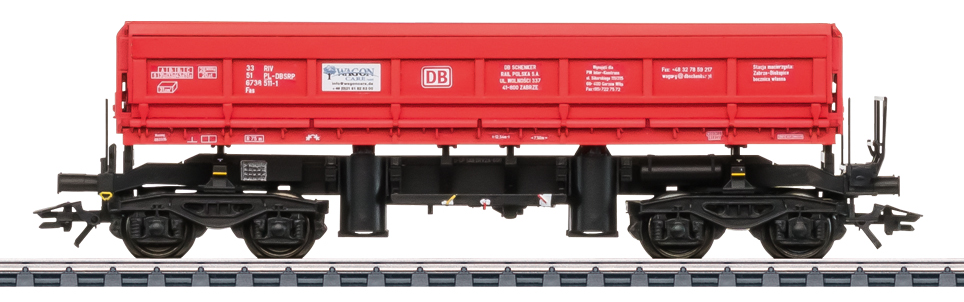 Vorbild: vierachsiger offener Seitenkippwagen Bauart Fas der DB Schenker Rail Polska S.A., mit gerippten Seitenwänden und Übergangsbühnen. Verkehrsrote Grundfarbgebung. Betriebszustand um 2016.
