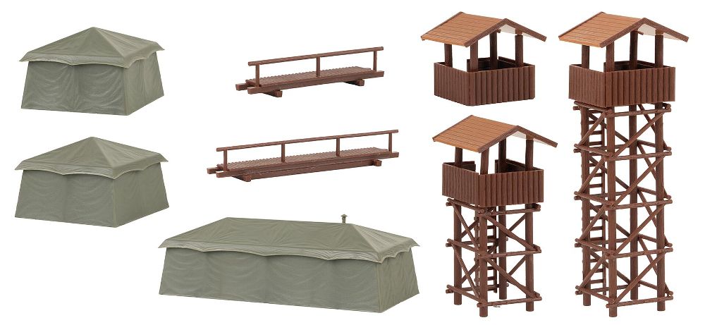 Achtung, stillgestanden! Staub wirbelt durch die Luft, als 7 trainierte Miniatur-Soldaten in Uniform (im Set enthalten) über den Truppenübungsplatz preschen. Vorbei an allerlei Trainingsgeräten, zwei Aussichtstürmen in Holzoptik und einer überdachten Plattform, vorbei an vier Einpersonenzelten und weiterem Zubehör wie Stacheldrahtzäunen. Drei große Lagerzelte in typischem Militärgrün runden die Szenerie ab. Dieses Set ist perfekt geeignet, um die Militär-Miniaturanlage mit mehr Details zu verschönern. _x000D_Inhalt: Lagerzelte (3 x), Einpersonenzelte (4 x), Stacheldrahtzäune (7 x), Aussichtstürme (2 x), überdachte Plattform, Trainingsgeräte, Leitern, 7 Miniatur-Soldaten_x000D_