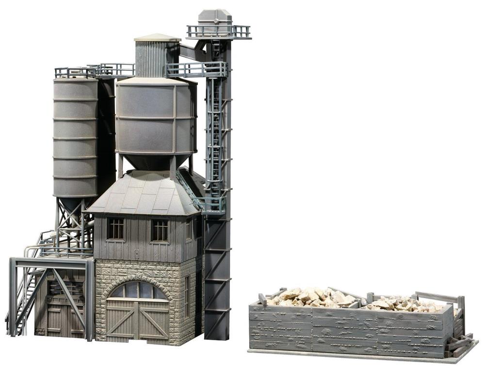 Turmmischanlage mit Aufzug, Hochsilos und einer Bühne mit Treppenaufgang. Das große Tor des gemauerten Mischturms ermöglicht Transportfahrzeugen die Einfahrt. Großvolumige Bansen in Holzbauweise mit passendem Schüttgutmaterial liegen dem Bausatz bei. Modell ohne Funktion.